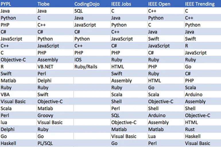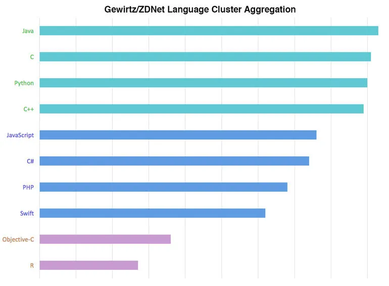 如你所见,这些语言分成了三大类。第一梯队包括 Java、C、Python 和 C++,毫无疑问,你肯定经常听到它们的名字。第二梯队包括 JavaScript、C#、PHP 和 Swift。剩下的两个是 Objective-C 和 R。