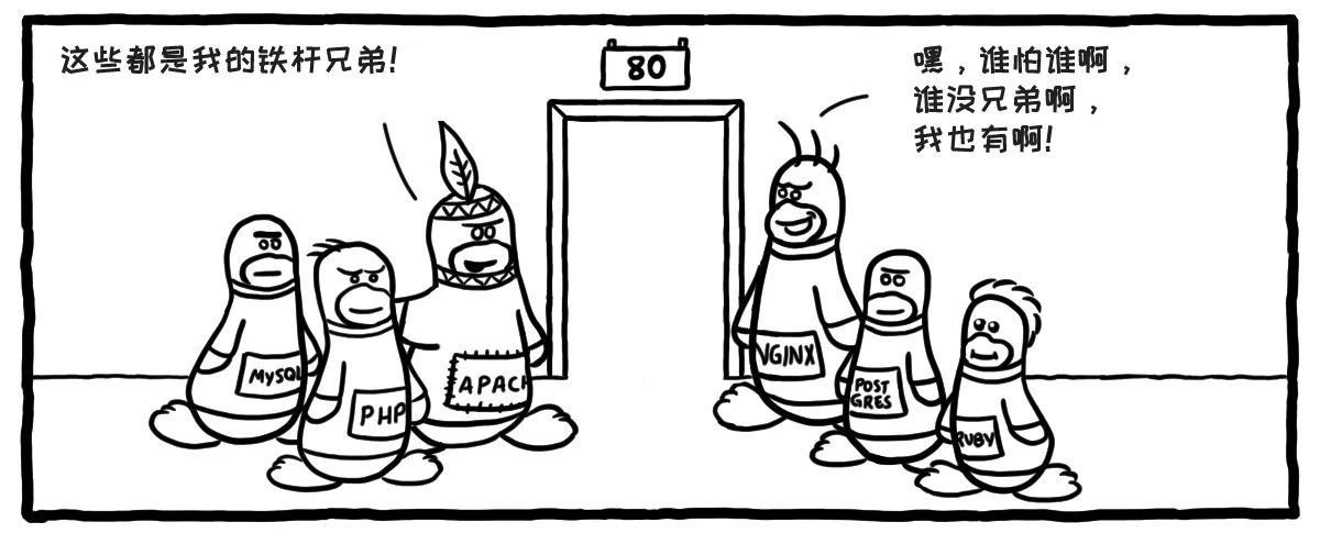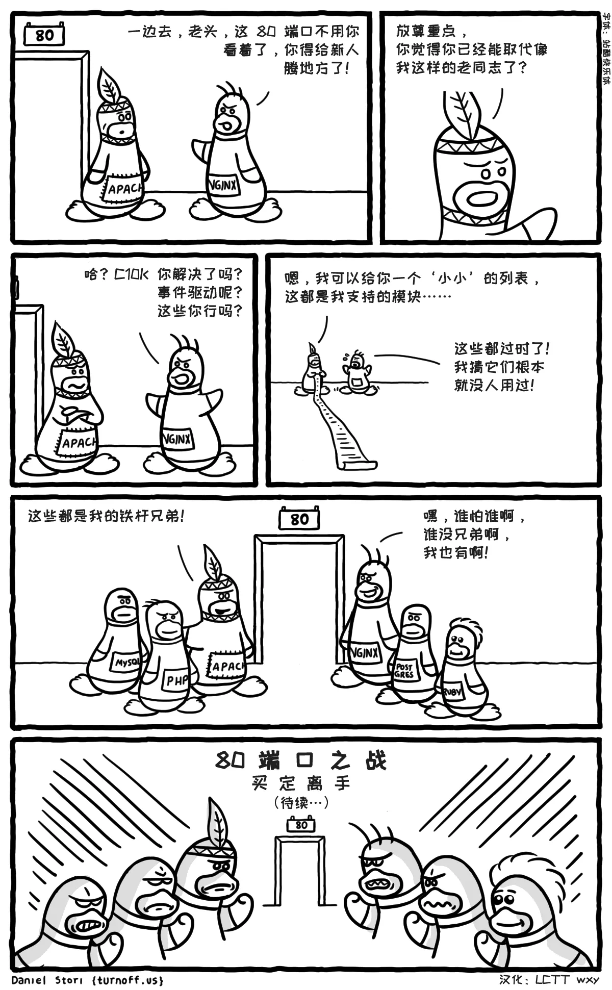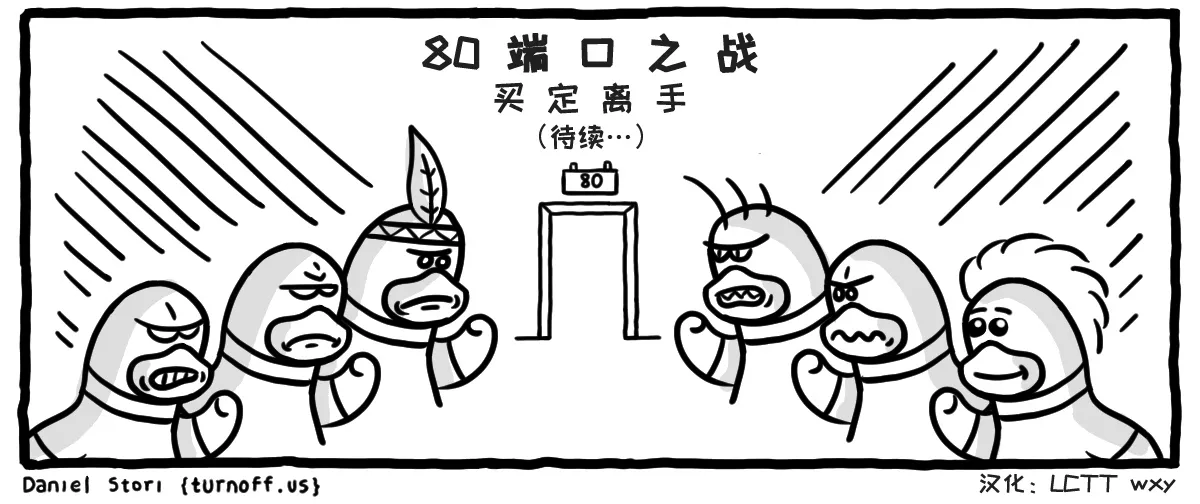嗨,大家好,今天我们来聊聊 80 端口之战。著名的技术漫画站 turnoff.us 有这样的一副漫画,生动的描绘了固守 80 端口的 Apache 和新生代的 Nginx 之间的战争。你知道,80 端口是 Web 端口,就是这个端口构成了我们现在大部分的互联网。
