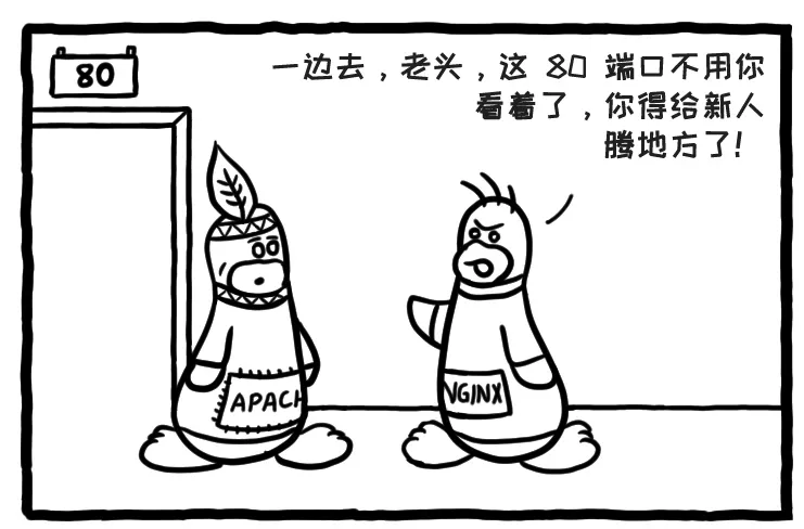 作为新生代的 Nginx 对已经 22 岁之老的 Apache 说,“一边去,老头,这 80 口不用你看着了,你得给新人腾腾地方了!”