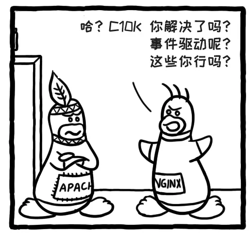 “哈?C10K 你解决了吗?事件驱动呢?这些你行吗?”Nginx 说。(C10K 指并发上万连接,由于服务器和网络性能的提升,现在的服务程序面临着处理更大并发的请求,而一些老旧的应用面对这种大量请求显然有点力不从心)