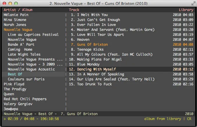 如果你钟爱命令行程序,那么 Cmus 会是你的菜。你能用它来播放 Ogg Vorbis、MP3、FLAC、Opus、Musepack、WavPack、WAV、AAC、MP4、音频 CD 以及 ffmpeg 支持的所有格式(WMA、APE、MKA、TTA、SHN 等等)和 libmodplug。你也可以用它来播放 Shoutcast 或者 Icecast 的音频流。它不是特性最丰富的音乐播放器,但它拥有所有的基础及进阶功能。它的主要优势是非常轻量,并且它的内存需求真的很小。