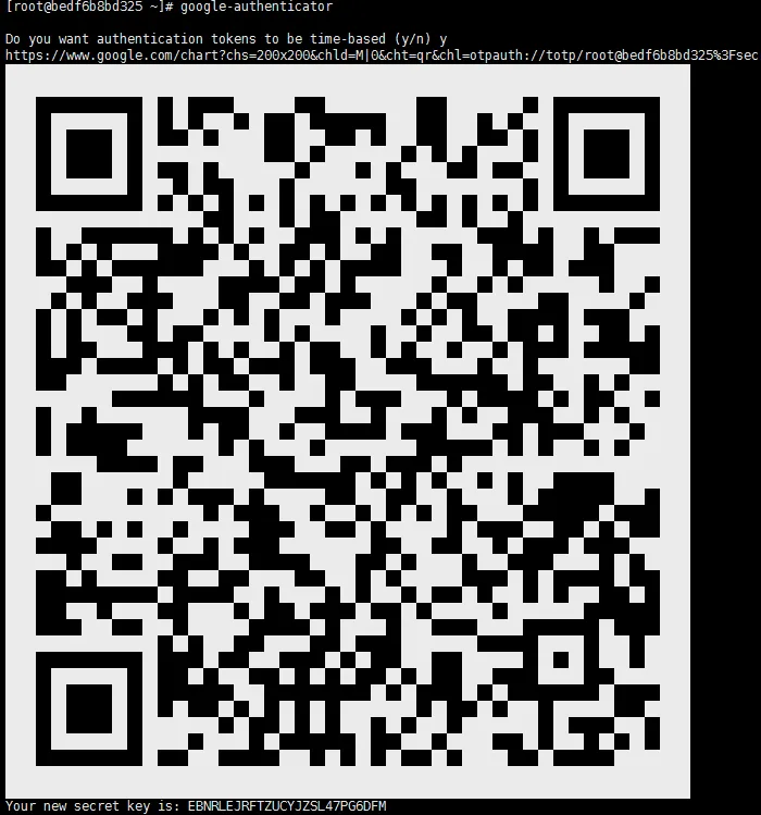 输入 y之后你将看到一个代表着该“场景”密钥的二维码和密钥字符串,它使用如下二维码图形格式表示我们数字形态的密钥(这里也提供了一个用于在浏览器中再次显示该二维码的 URL,但是需要翻墙)。接着我们要用到它在“运维密码”上完成配置。(安装 google-authenticator 过程中若出现二维码无法显示的问题,请检查系统中是否安装了二维码生成器:rpm - q qrencode,若未安装,请运行命令 yum install qrencode -y 安装后重试。)