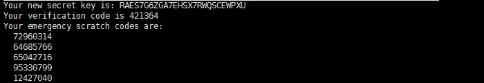 在二维码和密钥字符串后面,接着显示了一个当前的校验码和几个紧急密钥。紧急密钥你可以另行保存的一个安全的地方,以防你在无法使用 Google 身份验证器应用或“运维密码”时使用(紧急密钥是 8 位的,不同于普通的 6 位密钥,也是一次性使用的)。