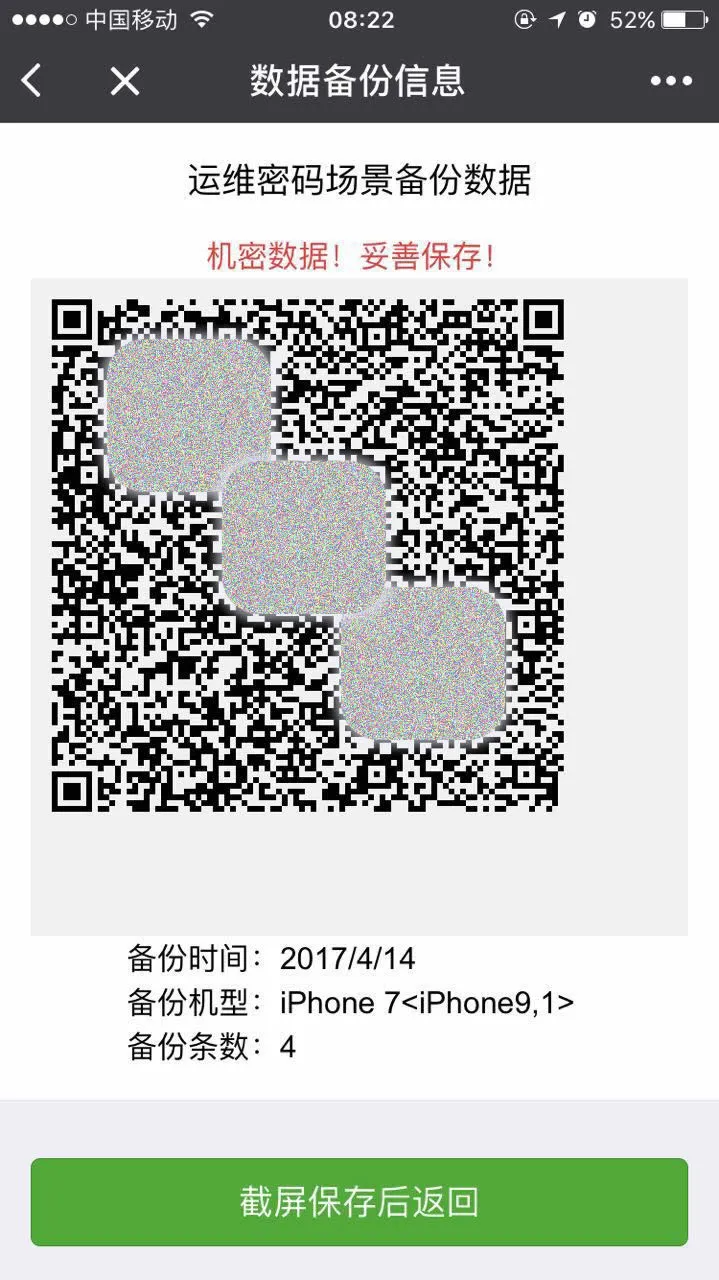目前我们提供了本地备份功能。限于微信小程序的限制,我们不能保存文件,只能将备份信息以二维码的方式备份出来。您可以将该二维码截屏,保存到安全可靠的地方,以备以后需要时恢复。
