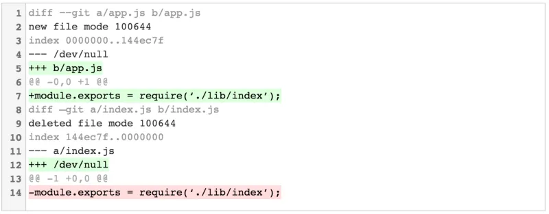 不像其他的版本控制系统,Git 不会明确地存储文件被重命名了的事实。例如,如果我编辑了一个简单的 Node.js 应用并且将 index.js 重命名为 app.js,然后运行 git diff,我会得到一个看起来像一个文件被删除另一个文件被新建的结果。