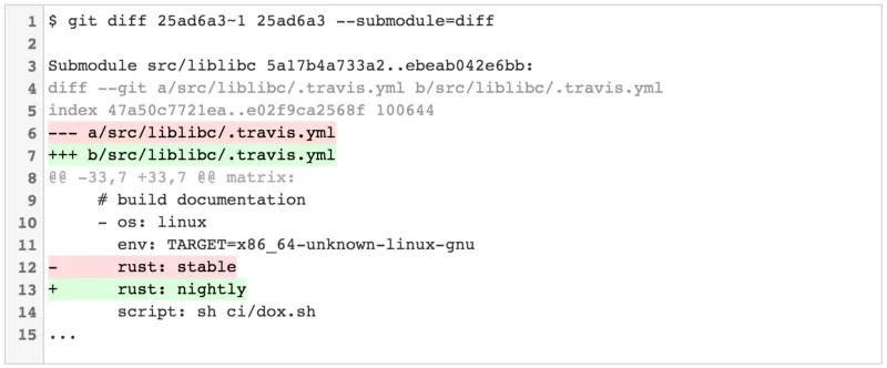 在 Git v2.11 之前,Git 有两种模式来显示对更新你的仓库子模块的提交之间的差异。