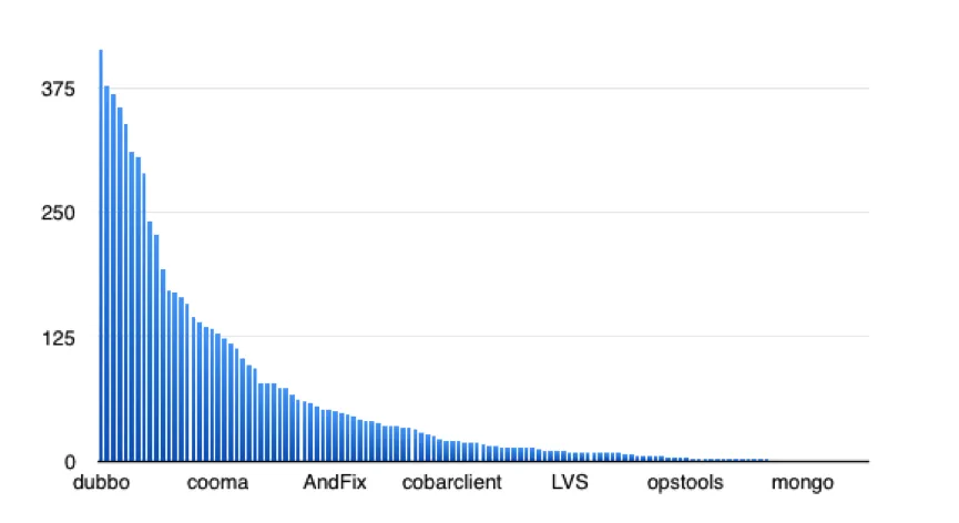从整体的这些项目来看,各个项目的提交数明显呈长尾样分布: