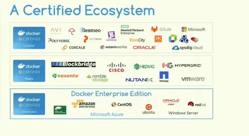 相比于 Docker CE(Community Edition),Docker EE 强化了其安全特性,为企业提供更加安全和可靠的容器服务,提供了一系列的安全组件和认证设施,更加满足企业的安全需求。并通过认证生态系统,笼络了大量的能够为用户提供服务的企业。