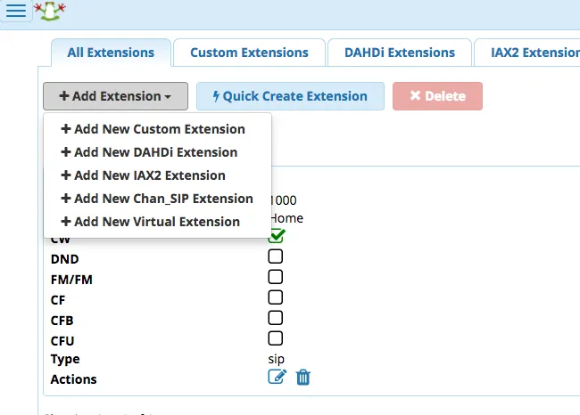 登录之后,我进入位于显示屏左上方的 应用菜单 Application Menu 。点击菜单链接并选择了第二个选项,即 “应用” Applications ,接着选择了第四个选项, “分机” Extensions 。从那里我选择创建一个 New Chan_Sip 分机。