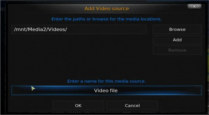 点击在主页的“ 视频 ”选项来进入视频页面。选择“ 文件 ”选项,在下一个页面点击“ 添加视频… ”,这将会使得用户进入Kodi 的添加媒体页面。在这个页面,你可以随意的添加媒体源了(包括内部和外部的)。