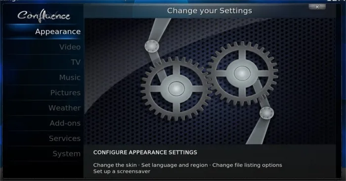 用户可以修改任何设置,从安装 Kodi 仓库的插件,到激活各种服务,到改变主题,甚至天气。如果想要退出设定区域并且返回主页面,点击右下方角落中的“home”图标。