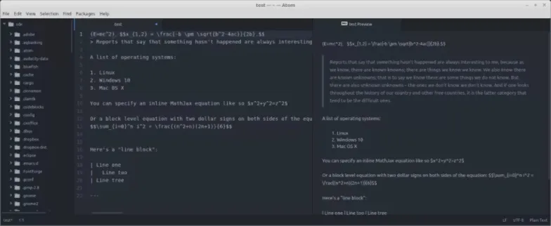 但是,开源拥有强大的力量,这是我强烈提倡开源的一个重要原因。Atom 上有许多包以及一些复刻,从而添加了缺失的功能特性。比如,Markdown Preview Plus 提供了 Markdown 文件的实时预览,并伴有数学公式渲染和实时重加载。另外,你也可以尝试一下 Markdown Preview Enhanced。如果你需要自动滚动特性,那么 markdown-scroll-sync 可以满足你的需求。我是 Markdown-Writer和 Markdown-pdf的忠实拥趸,后者支持将 Markdown 快速转换为 PDF、PNG 以及 JPEG 文件。