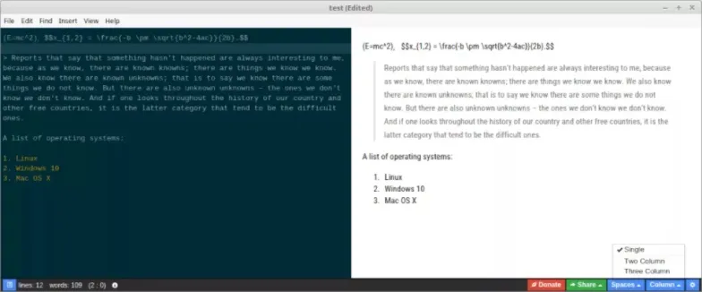 该应用有一系列有用的特性,包括拼写检查、以 HTML 格式保存文件或把富文本复制粘贴到邮件客户端。你也可以在侧窗中显示文档目录,展示语法高亮代码、以及助手、锚点和隐藏字符等。它目前正处于早期的开发阶段,因此还有一些很基本的 bug 需要修复,但它值得关注。它有两个主题可用,如果有能力,你也可以添加你自己的主题。