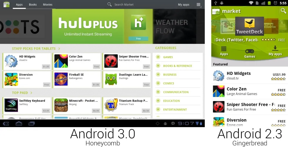 新的市场不仅出售应用,还加入了书籍和电影租借。谷歌从 2010 年开始出售图书;之前只通过网站出售。新的市场将谷歌所有的内容销售聚合到了一处,进一步向苹果 iTunes 所的主宰地位展开较量。虽然在“安卓市场”出售这些东西有点品牌混乱,因为大部分内容都不依赖于安卓才能使用。