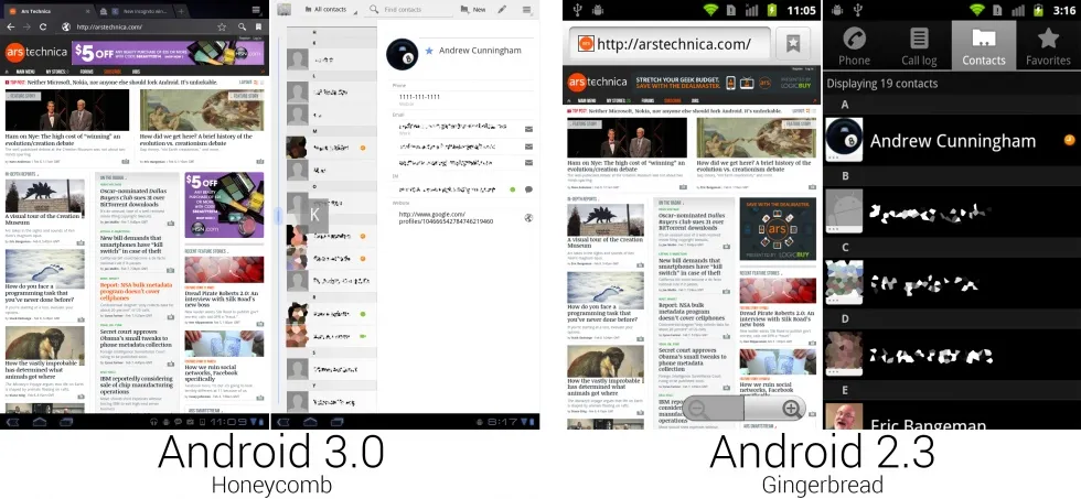 安卓 3.2 的兼容性缩放和一个安卓平板上典型的展开视图应用。 [Ron Amadeo 供图]