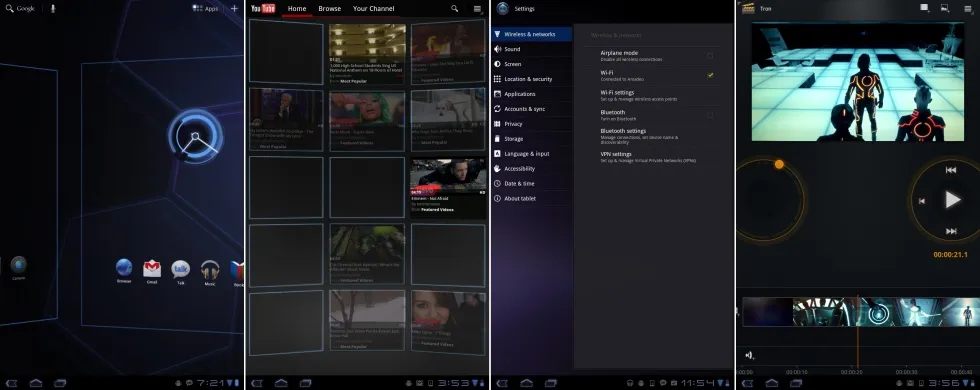 蜂巢新增的应用“电影工作室”,这不是一个不言自明的应用,而且没有任何的解释或说明。就我们所知,你可以导入视频,剪切它们,添加文本和场景过渡。编辑视频——电脑上你可以做的最耗时、困难,以及处理器密集型任务之一 —— 在平板上完成感觉有点野心过大了,谷歌在之后的版本里将其完全移除了。电影工作室里我们最喜欢的部分是它完全的电子风格主题。虽然系统的其它部分使用蓝色高亮,在这里是橙色的。(电影工作室是个邪恶的程序!)