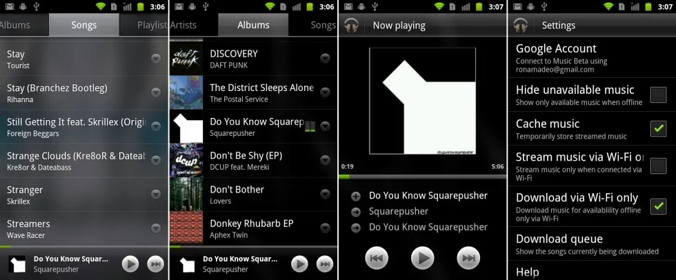 新 Google Music 为安卓 2.2 及以上版本设计,借鉴了 Cooliris 相册的设计语言,但也有改变之处,背景使用了模糊处理的图片。几乎所有东西都是透明的:弹出菜单,顶部标签页,还有底部的正在播放栏。可以下载单独的歌曲或整个播放列表到设备上离线播放,这让 Google Music 成为一个让音乐同步到你所有设备的好途径。除了移动应用外,Google Music 还有一个 Web 应用,让它可以在任何一台桌面电脑上使用。