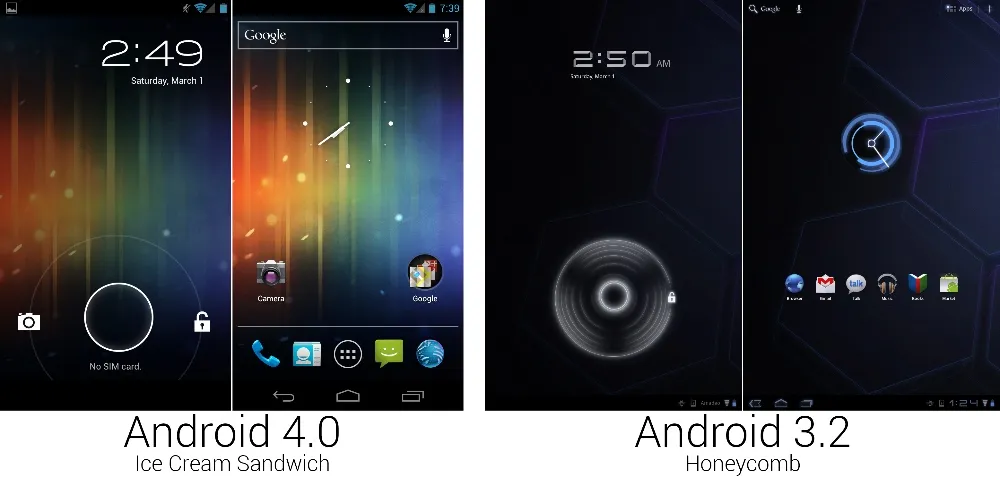 蜂巢的系统栏在手机上一分为二。在顶上是传统的状态栏,底部是新的系统栏,放着三个系统按钮:后退、主屏幕、最近应用。一个固定的搜索栏放置在了主屏幕顶部。该栏以和底栏一样的方式固定在屏幕上,所以在五个主屏上,它总共占据了 20 个图标大小的位置。在蜂巢的锁屏上,内部的小圆圈可以向大圆圈外的任意位置滑动来解锁设备。在冰淇淋三明治,你得把小圆圈移动到解锁图标上。这个新准确度要求允许谷歌向锁屏添加新的选项:一个相机快捷方式。将小圆圈拖向相机图标会直接启动相机,跳过了主屏幕。