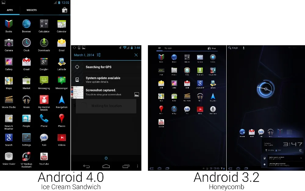 因为我们现在回到了手机上,所以短信,新闻和天气,电话,以及语音拨号都回来了,以及 Cordy,一个平板的游戏,被移除了。尽管不是 Nexus 设备,我们的截图还是来自 Verizon 版的设备,可以从图上看到有像 “My Verizon Mobile” 和 “VZ Backup Assistant” 这样没用的应用。为了和冰淇淋三明治的去电子风格主题一致,日历和相机图标现在看起来更像是来自地球的东西而不是来自外星球。时钟,下载,电话,以及安卓市场同样得到了新图标,“联系人”获得了新图标,还有新名字 “People”。