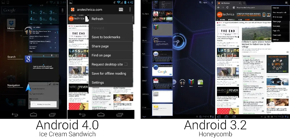 冰淇凌三明治中新增了“滑动标签页”设计,替换掉了谷歌之前推行的 2×3 方阵导航屏幕。一个标签页栏放置在了操作栏下方,位于中间的标签显示的是当前页面,左右侧的两个标签显示的是对应的当前页面的左右侧页面。向左右滑动可以切换标签页,或者你可以点击指定页面的标签跳转过去。
