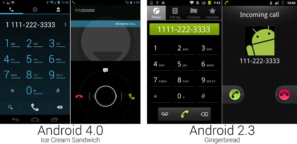 因为蜂巢只给平板使用,所以一些界面设计直接超前于姜饼。冰淇淋三明治的新拨号界面就是如此,黑色和蓝色相间,并且使用了可滑动切换的小标签。尽管冰淇淋三明治终于做对了,将电话主体和联系人独立开来,但电话应用还是有它自己的联系人标签。现在有两个地方可以看到你的联系人列表——一个有着暗色主题,另一个有着亮色主题。由于实体搜索按钮不再是硬性要求,底部的按钮栏的语音信息快捷方式被替换为了搜索图标。