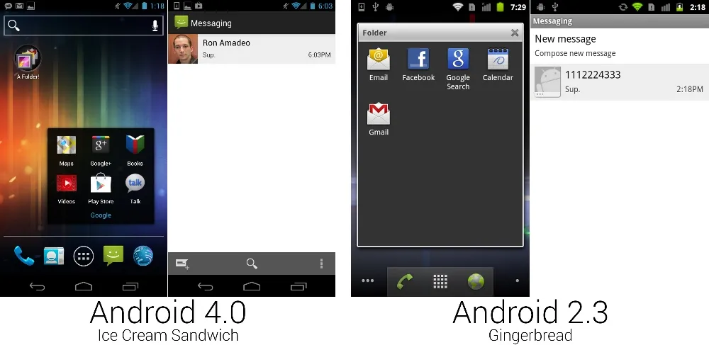 蜂巢没有文件夹和信息应用,所以这里是冰淇淋三明治和姜饼的对比。 [Ron Amadeo 供图]