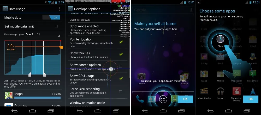 开发者选项通常只有一点点设置选项,但是在冰淇淋三明治中,这部分有非常多选项。谷歌添加了所有类型的屏幕诊断显示浮层来帮助开发者理解他们的应用中发生了什么。你可以看到 CPU 使用率,触摸点位置,还有视图界面更新。还有些选项可以更改系统功能,比如控制动画速度,后台处理,以及 GPU 渲染。
