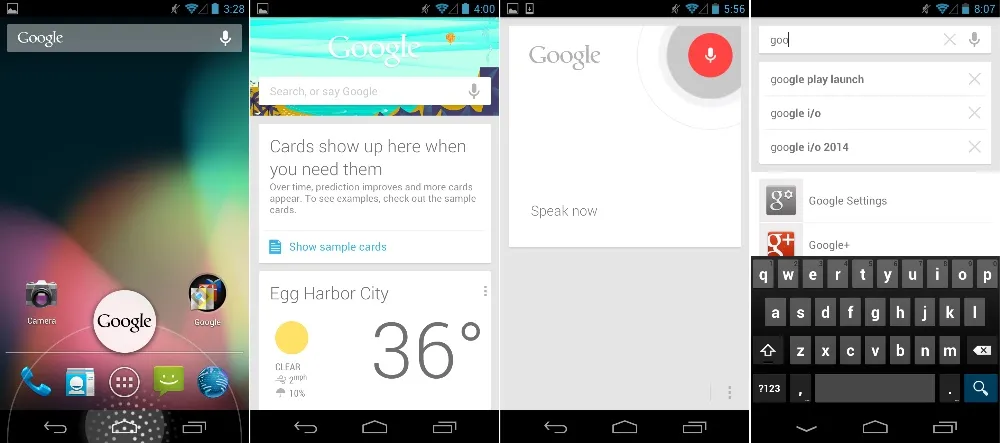 果冻豆中不止对安卓而言,也是对谷歌来说最大的特性,是新版谷歌搜索应用。它带来了“Google Now”,一个预测性搜索功能。Google Now 在搜索框下面显示为几张卡片,它会提供谷歌认为你所关心的事物的搜索结果。就比如谷歌地图搜索你最近在桌面电脑查找的地点或日历的约会地点、天气,以及旅行时回家的时间。