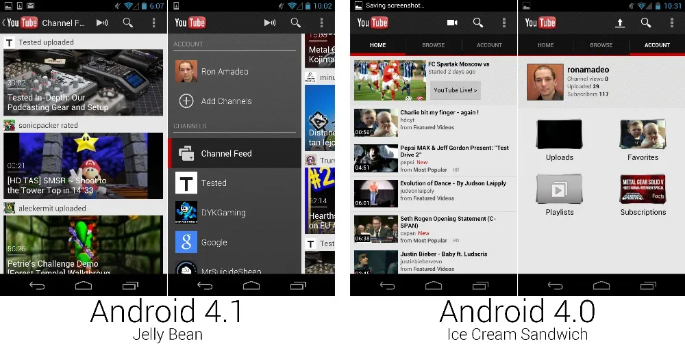 Youtube 是首批在应用左侧加入滑动抽屉的应用之一,该特性会成为谷歌应用的标准设计风格。抽屉中有你的账户的链接和订阅频道,这让谷歌可以去除页面顶部标签页设计。