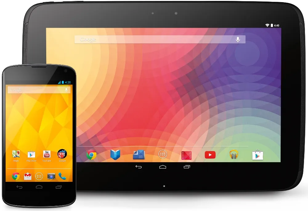 和安卓 4.2 一同发布的还有两部旗舰设备,Nexus 4 和 Nexus 10,都由谷歌直接在 Play 商店出售。Nexus 4 使用了 Nexus 7 的策略,令人惊讶的低价和高质量,并且无锁设备售价 300 美元。Nexus 4 有一个 4 核 1.5GHz 骁龙 S4 Pro 处理器,2GB 内存以及 1280×768 分辨率 4.7 英寸 LCD 显示屏。谷歌的新旗舰手机由 LG 生产,并和制造商一起将关注点转向了材料和质量。Nexus 4 有着正反两面双面玻璃,这会让你爱不释手,它是有史以来触感最佳的安卓手机之一。Nexus 4 最大的缺点是没有 LTE 支持,那时候大部分手机,包括 Version Galaxy Nexus 都有更快的基带。但 Nexus 4 的需求仍大大超出了谷歌的预料——发布当日大量的流量拖垮了 Play 商店网站。手机在一小时之内销售一空。