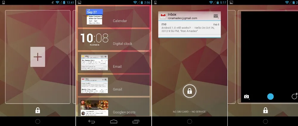锁屏的添加小部件页面,小部件列表,锁屏上的 Gmail 部件,以及滑动到相机。 [Ron Amadeo 供图]