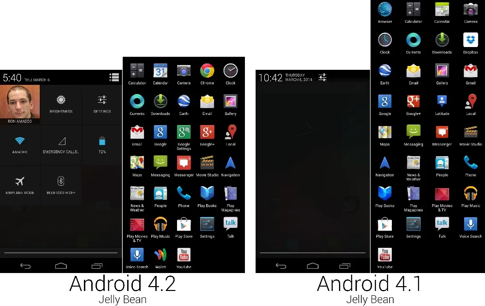 应用抽屉和 4.2 中的应用阵容有很多改变。得益于 Nexus 4 更宽的屏幕横纵比(5:3,Galaxy Nexus 是 16:9),应用抽屉可以显示一行五个应用图标的方阵。4.2 将自带的浏览器替换为了 Google Chrome,自带的日历换成了 Google Calendar,它们都带来了新的图标设计。时钟和相机应用在 4.2 中经过了重制,新的图标也是其中的一部分。“Google Settings”是个新应用,用于提供对系统范围内所有存在的谷歌账户设置的快捷方式,它有着和 Google Search 和 Google+ 图标一致的风格。谷歌地图拥有了新图标,谷歌纵横,以往是谷歌地图的一部分,作为对 Google+ location 的支持在这个版本退役。