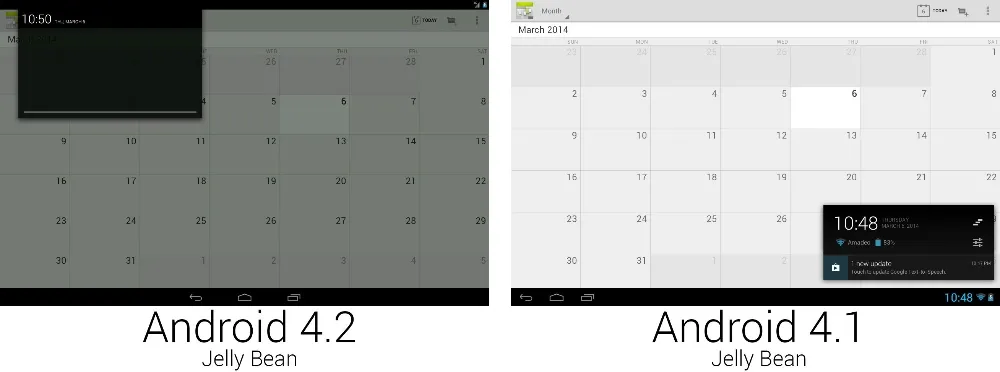 安卓 4.2 中最有争议的改变是平板界面,从单独一个统一的底部系统栏变成带有顶部状态栏和底部系统栏的双栏设计。新设计统一了手机和平板的界面,但批评人士说将手机界面延展到 10 英寸的横向平板上是浪费空间。因为导航按键现在拥有了整个底栏,所以他们像手机界面那样被居中。