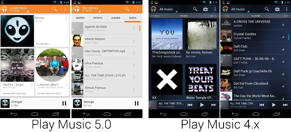 在 I/O 大会推出的另一个应用更新是 Google Music 应用。音乐应用经过了完全的重新设计,最终摆脱了蜂巢中引入的蓝底蓝色调的设计。Play Music 的设计和几个月前发布的 Play 商店一致,有着响应式的白色卡片布局。Music 同时还是最早采用新抽屉导航样式的主要应用之一。谷歌还随新应用发布了 Google Play Music All Access,每月 10 美元的包月音乐订阅服务。Google Music 现在拥有订阅计划,音乐购买,以及云端音乐存储空间。这个版本还引入了“Instant Mix”,谷歌会在云端给相似的歌曲计算出一份歌单。