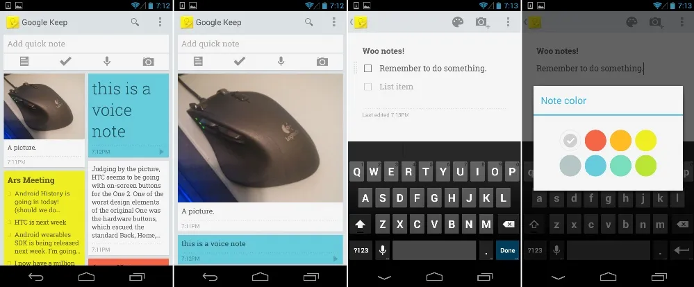 毫无疑问一些产品为了赶上 Google I/O 大会的发布准时开发完成了,但是三个半小时内的主题已经够多了,一些产品在大会的发布上忽略了。Google I/O 大会的三天后一切都清楚了,谷歌带来了 Google Keep,一个用于安卓和在线的笔记应用。Keep 看起来很简单,就是一个用上了响应式 Google-Now 风格设计的笔记应用。用户可以改变卡片的尺寸,从多栏布局改为单列视图。笔记可以由文本,清单,自动转文本的语音或者图片组成。笔记卡片可以拖动并在主界面重新组织,你甚至可以给笔记换个颜色。