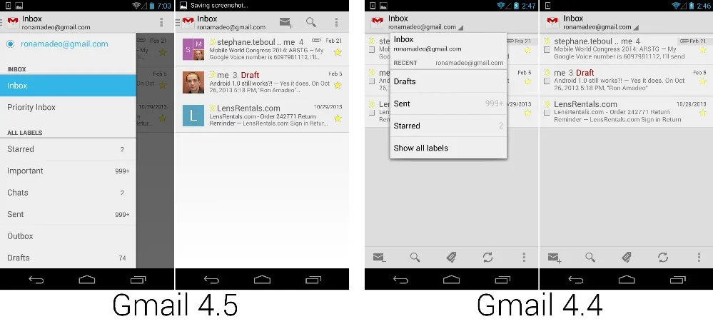 Gmail 4.5,换上了新的导航抽屉设计,去掉了几个按钮并将操作栏合并到了抽屉里。 [Ron Amadeo 供图]