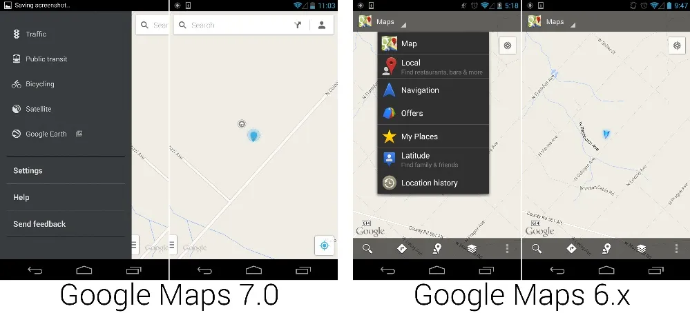 一个月后,谷歌在 Play 商店发布了全新的谷歌地图。这是谷歌地图自冰淇淋三明治以来第一个经过细致地重新设计的版本。新版本完全适配了 Google Now 白色卡片审美,还大大减少了屏幕上显示的元素。新版谷歌地图似乎设计时有意使地图总是显示在屏幕上,你很难找到除了设置页面之外还能完全覆盖地图显示的选项。