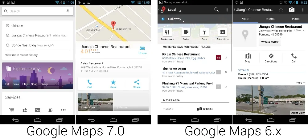地点页面重新设计以显示更有用的信息概览。在第一页,新版添加了重要信息,比如地图上的位置,点评得分,以及点评数目。因为这是个手机,所以软件内可以直接拨打电话,电话号码的显示被认为是毫无意义的,被去掉了。旧版地点显示到那里的距离,新版谷歌地图显示到那里的时间,基于交通状况和偏好的交通方式——一个更加实用的衡量方式。新版还在中间放了个分享按钮,这使得通过即时通讯或短信协调的时候更加方便。