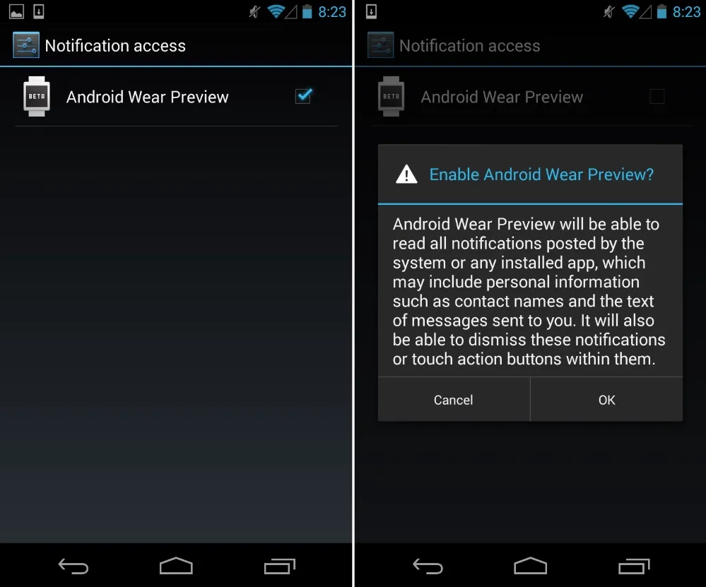 但许多新增功能似乎只为了一个目的——安卓 4.3 是谷歌对可穿戴计算支持的特洛伊木马。4.3 加入了低功耗蓝牙支持,使用很少的能耗将安卓和其它设备连接到一起并传输数据——可穿戴设备的必要特性。安卓 4.3 还添加了“通知访问权限”API,允许应用完全复制和控制通知面板。应用可以显示通知文本以及和用户操作一样地和通知交互——也就是点击操作按钮和消除通知。当你有个通知面板时从本机应用做这个操作没什么意义,但是在一个独立于你手机的设备上,复制通知面板的消息就显得很有用了。为数不多的接入的应用是 “Android Wear Preview(安卓可穿戴预览)”,使用了通知 API 驱动大部分的 Android Wear 界面。