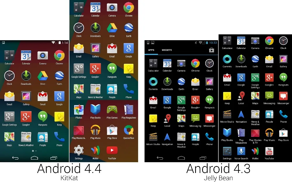 奇巧的图标阵容相对 4.3 有显著的变化。更戏剧化地说,这是一场大屠杀,谷歌从 4.3 的配置中移除了七个图标。谷歌 Hangouts 现在能够处理短信,所以“信息”应用被去除了。Hangouts 同时还接手了 Google Messenger 的职责,所以它的图标也不见了。Google Currents 不再作为默认应用预装,因为它不久后就会被终结——和它一起的还有 Google Play Magazines(Play 杂志),取代它们的是 Google Play Newsstand(Play 报刊亭)。谷歌地图被打回一个图标,这意味着本地和导航的快捷方式被去掉了。难以理解的 Movie Studio 也被去除了——谷歌肯定已经意识到了没人想在手机上剪辑电影。有了主屏的“OK Google”关键词检测,语音搜索图标的呈现就显得多余了,因而将其移除。令人沮丧的是,没人用的新闻和天气应用还在。