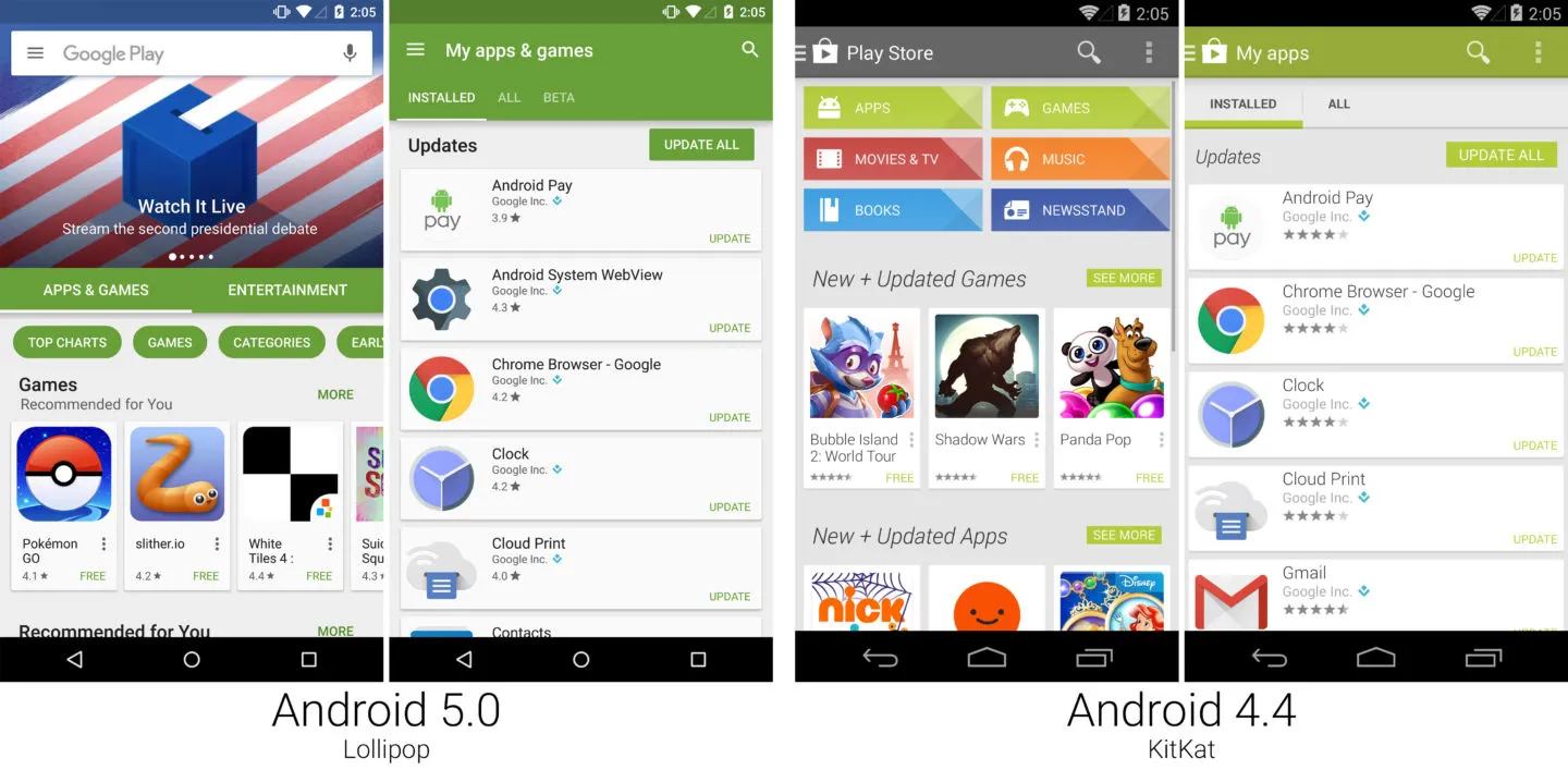 Play 商店遵从了和其它棒棒糖应用相似的轨迹。它在视觉上焕然疑一新,大胆的色彩,新排版,还有一个全新的布局。通常这里不会有什么新增功能,就只是给一切换件新马甲。