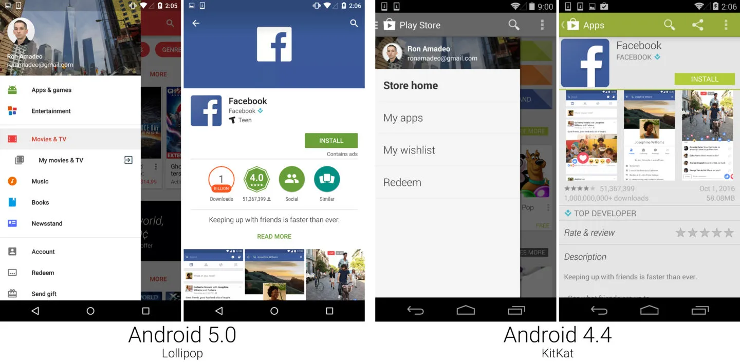 Play 商店的导航面板现在真的可以用于导航了,每个分类有各自的入口。棒棒糖也不再在操作栏放“更多”按钮了,取而代之的是一个独立的操作按钮(通常是搜索),并且去掉了导航栏中多余的选项。这给了用户一个单独的地方来查找项目,而不用在两个菜单中寻找搜索的地方。