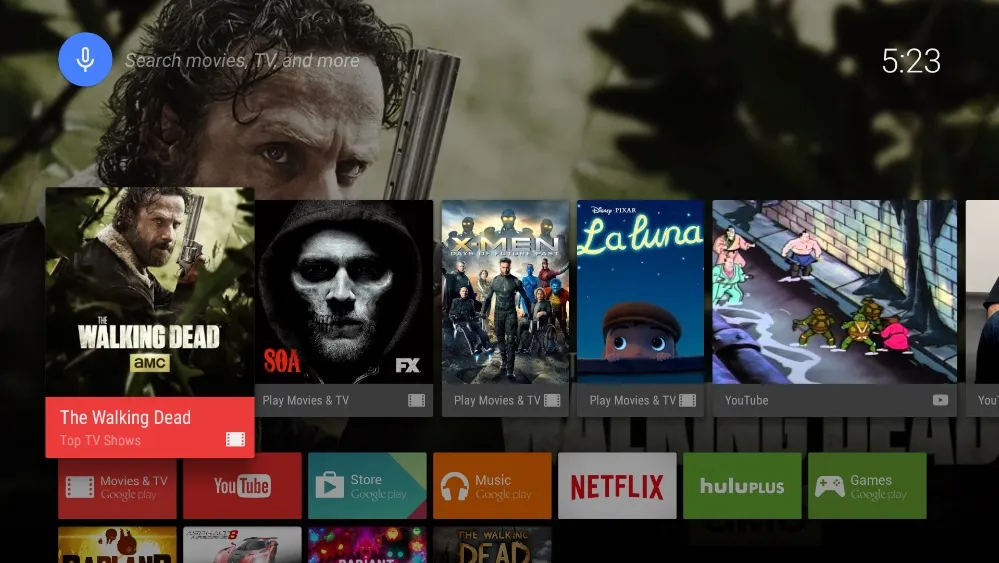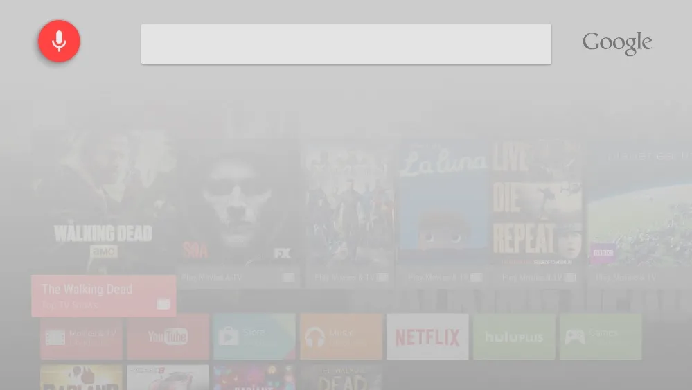 安卓 TV 的界面很简单。大幅的媒体略缩图占据了屏幕,可以横向滚动,这些媒体中有 Youtube、Google Play、Netflix、Hulu 以及其它来源。这些略缩图实际上是来自不同媒体源的“推荐”项目,它不是简单地将一个应用的内容填满屏幕。在那下面你可以直接访问应用和设置。