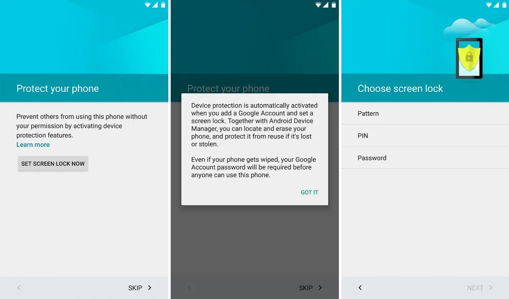 设备保护是唯一的新增界面,采用的是在开机设置显示新警告的形式。这个特性在设备被偷了之后“保护你的设备不被再次利用”。一旦设置了锁屏,设备保护就开始介入,并且会在擦除设备的时候被触发。如果你以机主正常的方式擦除设备——解锁手机并从设置选择“重置”——什么都不会发生。但如果你通过开发者工具擦除,设备会在下次开机设置的时候要求你“验证之前同步的谷歌账户”。