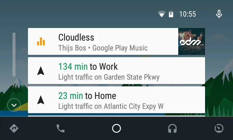 算下来特性实际上只有四部分,导航栏从左到右是:谷歌地图,一个拨号/联系人界面,“主屏”部分混合了 Google Now 和一个通知面板,还有一个音乐页面。最后一个按钮是一个“OEM”页面,让你可以退出安卓 Auto,返回到自带的车载系统(这也是为了放置汽车制造商的定制特性)。安卓 Auto 还带有谷歌的语音命令系统,以一个麦克风按钮的形式显示在屏幕右上角。