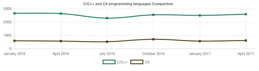 在应用程序领域中使用的另一种语言是 C++。虽然它的数量不能与 Java 竞争,但它仍然在这个领域占据了很大的市场份额。而且每 3 个招聘中有一个要求 Java,C++ 则是每 4 个中有一个要求它。与 Java 非常类似,其数量在过去六个季度中保持相对稳定。C++ 一直被大量使用,即使 Java 已经取代它,它仍然是一种高度相关的语言。