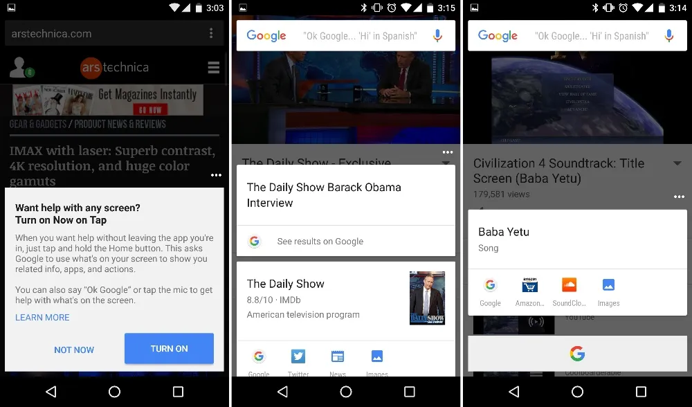 Now on Tap 产生的结果不是通常的 10 个蓝色链接——即便那必定有一个通往谷歌搜索的链接。Now on Tap 还可以深度连接到其它使用了谷歌的应用索引功能的应用。他们的想法是你可以在 Youtube 音乐视频那里唤出 Now on tap,然后获得一个到谷歌 Play 或亚马逊“购买”页面的链接。在演员新闻文章处唤出 Now on Tap 可以链接到 IMDb 应用中该演员的页面上。