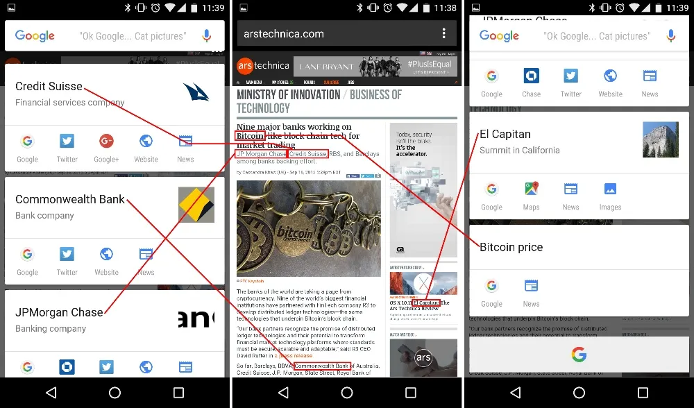 棉花糖的头等新特性之一就是“Google Now on Tap”。有了 Now on Tap,你可以在安卓的任意界面长按 home 键,安卓会将整个屏幕发送给谷歌进行处理。谷歌会试着分析页面上的内容,并从屏幕底部弹出显示一个特殊的搜索结果列表。