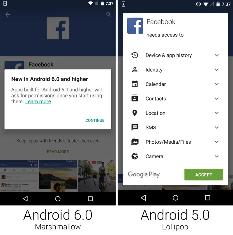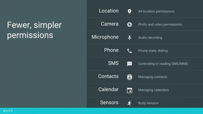 尽管谷歌在之前版本就试验过了,棉花糖的权限系统最大的不同是它代表了一个向权限系统的有序过渡。安卓 4.3 的 App Ops 从没有计划暴露给用户,所以开发者不了解它。在 4.3 中拒绝一个应用需要的一个权限经常导致奇怪的错误信息或一个彻底的崩溃。棉花糖的系统对开发者是缺省的——新的权限系统只适用于针对棉花糖 SDK 开发的应用,谷歌将它作为开发者已经为权限处理做好准备的信号。权限系统还允许在一项功能由于权限被拒绝无法正常工作时与用户进行沟通。应用会被告知它们的权限请求被拒绝,它们可以指导用户在需要该功能的时候去打开该权限访问。