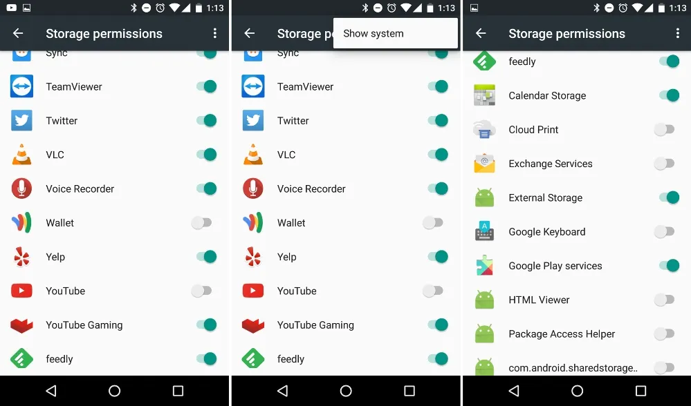 除了及时的“允许或拒绝”对话框,棉花糖还添加了一个权限设置界面。这个复选框大列表让数据敏感用户可以浏览应用拥有的权限。他们不仅可以通过应用来查询,也可以通过权限来查询。举个例子,你可以查看所有拥有访问麦克风权限的应用。